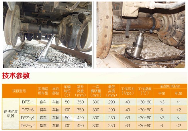 DFZ型全自動便攜式復軌器是一種頂軸式復軌器,它巧妙的運用了舉升力、重力與阻力三者之間的合力關系,不需要人為操縱何時舉升、橫移、復軌三個過程,自動完成復軌作業。對于機車、車輛的小距離脫軌,一分鐘便可復軌。是目前國內外最輕、最小、最快的復軌機具。