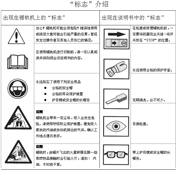 | 工作介紹 本部分介紹使用鋸軌機工作時的一般安全規則,操作時要遵守這些規則的要求,但有一點要強調:在出現事故等緊急情況下,若您附近沒有可叫來進行幫助或急救的人,請不要使用鋸軌機。 一般安全規則