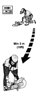 l 在啟動鋸軌機或進行切割期間,要隨時觀察機器附近是否有其他人員,以確保無任何人、動物或其他物品影響您的工作。 l 避免在不利條件下鋸軌,如:濃霧、大雨、強風或極冷的天氣等。在不利條件下工作易引起疲勞,甚至會出現危險后果。 l 若現場未準備就緒,或站立未穩,請勿開始工作。檢查周圍有無雜物,確保鋸軌過程中不會有任何雜物意外落下或飛起而造成傷害。斜坡地段工作時,更要加倍注意。 l 在鋸片旋轉狀態下,要隨時注意,不要讓衣服或身體的某一部分接觸鋸片。 l 發動機啟動后,請保持您的位置遠離鋸片。 l 啟動前,務必確保所有安保裝置都已安牢。 l 為保安全,請務必確保工作現場照明充足。 l 對操作者而言,有些工作位是強制要求的。 l 檢查周圍情況,確保沒有任何電線電纜橫穿鋸軌區域。